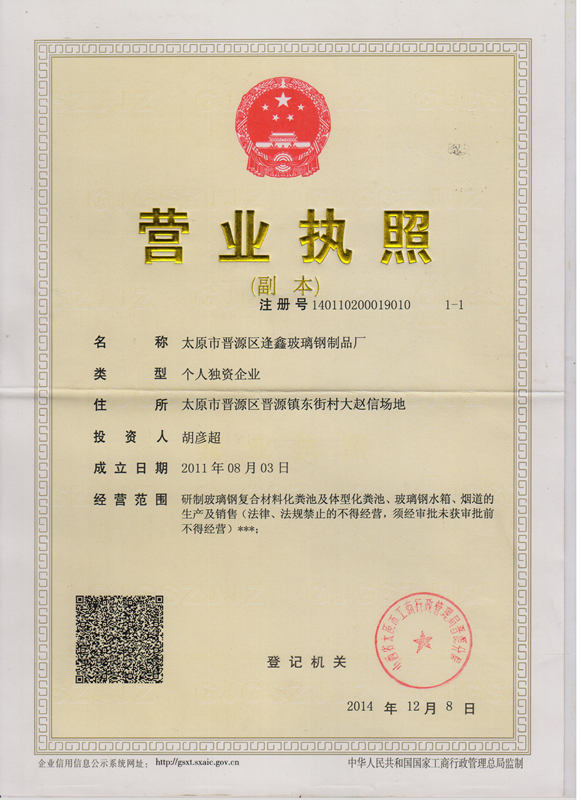 太原市晋源区逢鑫玻璃钢制品厂专业从事污水处理设施设计、开发、生产、销售。拥有较强的技术力量和专业制作安装人员。主导产品:各种类型玻璃钢化粪池。
